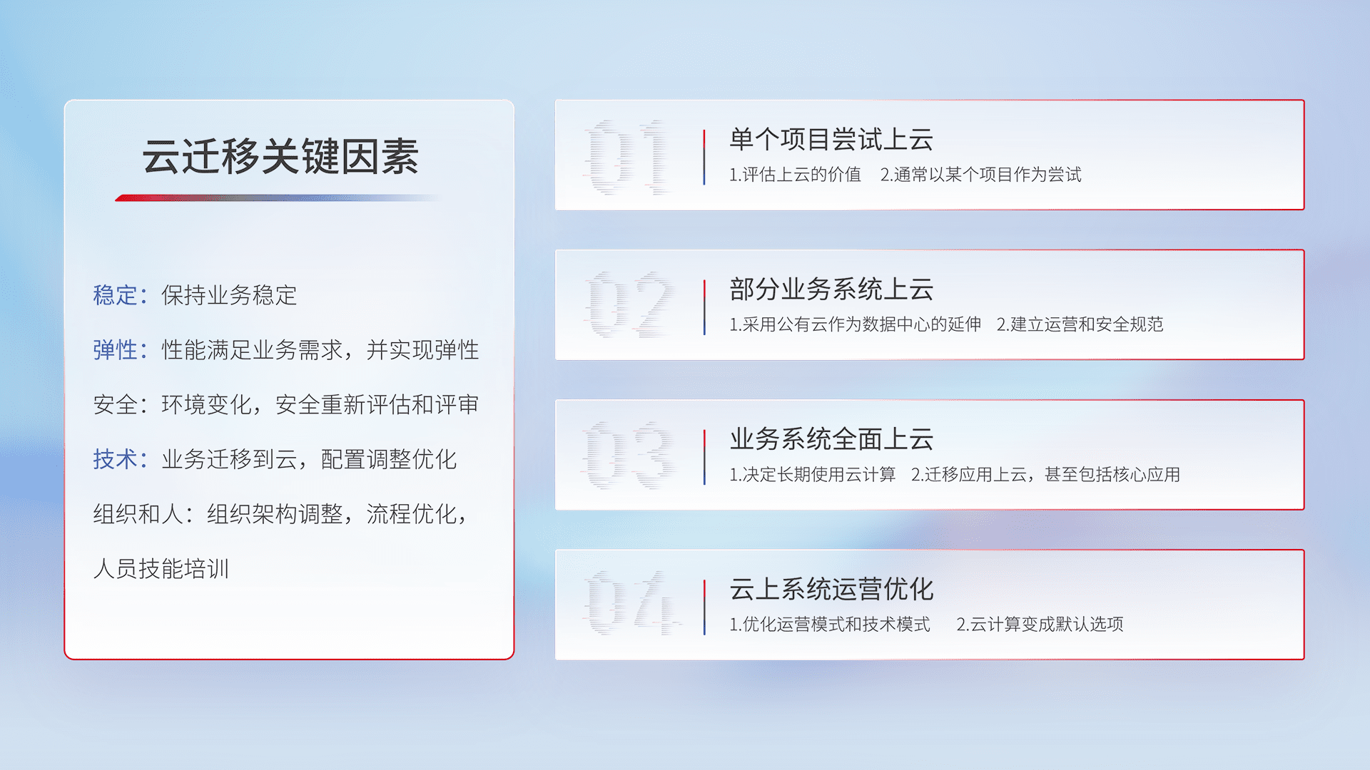 结合实际业务,,从规划设计、、、云平台选型、、、云原生改造、、数据迁移、、集成交付,,,,迁移全过程为客户识别最佳上云路径,,,,做好风险识别管理,,,,设计网络架构、、身份权限、、、安全审计合规、、操作审计、、、日志审计、、、监控告警策略、、、多站点容灾设计等,,,对云上基础设施进行整体规划,,,,提升IT治理水平,,,,以满足弹性、、、、高可用、、、高性能的需求。。。