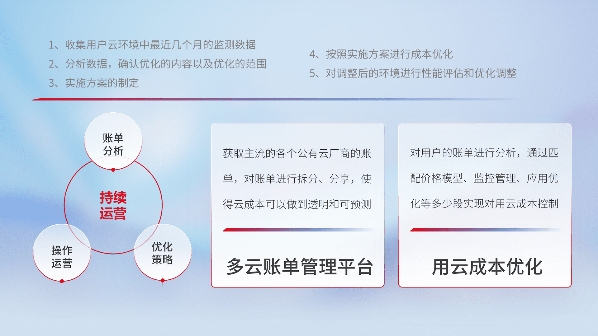 通过多云纳管,,,以统一的资源数据模型把客户的云资源进行抽象和封装,,,进而实现对多云资源的统一操作,,保障云资源管理的可靠性、、稳定性与可用性。。量身定制化运维内容,,,配置、、、开发运维、、、补丁管理、、备份、、、监控、、、、认证和访问管理、、、、审计和日常巡检等,,,保障在用云过程中的可靠度,,,稳定度以及高可用率。。。。