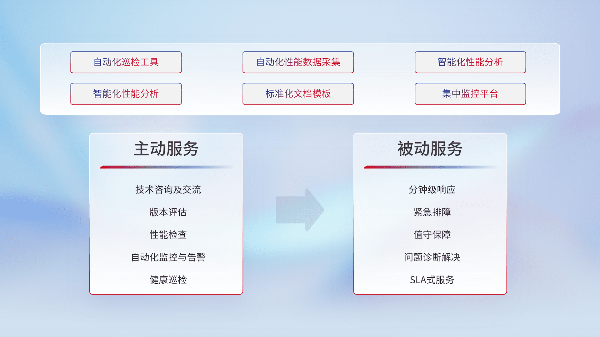 智能化工具和标准化文档,,,,保障服务质量,,,提供主动服务(包含技术咨询、、、版本评估、、、性能检查、、自动化监控与告警、、、健康巡检)和被动服务包含(分钟级响应、、、、紧急排障、、、、值守保障、、、、问题诊断解决、、、SLA服务)。。